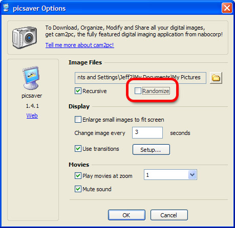 | | picsaver Configuration Screen Uncheck "Randomize" to play files in order (according to file name). |