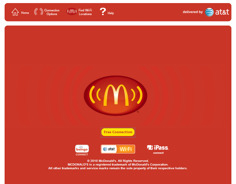 It's not free (usually)McDonald's started offering Wi-Fi in an era when wireless hotspots were less common and free Wi-Fi was even more rare. Today, free Wi-Fi isn't difficult to find. Jack in the Box is rushing free Internet to its restaurants. Even McDonald's Wi-Fi in the UK recently became free. While there are opportunities for free Wi-Fi at McDonald's, in general, you need to pay for it. Many sign on choices make picking the best one difficultThe main "Connection Options" page has six choices. The roaming partner choice leads to four more choices. Which ones will save you money? Are any of them free to you? Your food is getting cold while you try to decide. Luckily you found this guide! Must have a web browserYour laptop, iPhone, PSP or PDA should work fine. Your Nintendo DS works too with some extra hardware (though not for free anymore). However, some Wi-Fi enabled devices like VoIP phones and digital cameras will not work. These devices do not have a web browser to sign on to McDonald's Wi-Fi.
