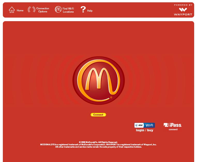 Single Connection 2 Hours of Internet for $2.95 Just enter your credit card number (it's secure) and you're on the 'net. Buying a single connection makes financial sense if: If you find yourself frequently paying for Wi-Fi hotspots or hotel Internet connections, a subscription may work out better for you. But if you just want to hop on McDonald's Wi-Fi every now and then, a single connection is probably the best deal for you. The only way to purchase a single Internet session at McDonald's is through AT&T (formerly Wayport) using your credit card. At $2.95, AT&T's single connection is a good deal among paid Internet hotspots. For example, T-Mobile HotSpot connections (available at Starbucks, Borders and many hotels and airports) are $6 for the first hour and 10 cents a minute thereafter. AT&T connections at Starbucks are $3.99 for two hours. However, fast food restaurants seem to be trending toward free Wi-Fi, which may someday make McDonald's paid Wi-Fi less attractive. AT&T accepts these credit cards: Visa, MasterCard, American Express and Diner's Club. Sorry Discover Card and PayPal users! Here's how to purchase a single Internet connection through AT&T: - On the McDonald's Wi-Fi welcome page, click the "Connect" button below the McDonald's logo. This takes you to the "Connection Options" page.