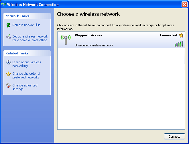 As you enter the McDonald's Wi-Fi zone, your laptop or other Wi-Fi-capable device will detect a wireless network. Follow the prompts to connect to the "Wayport_Access" network (see Windows screenshot).